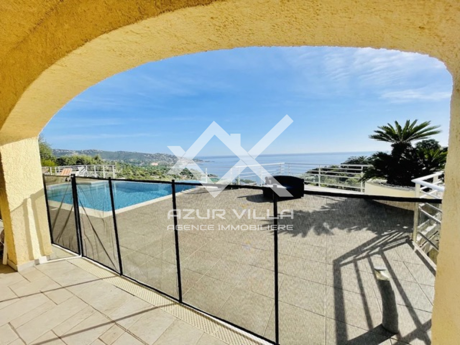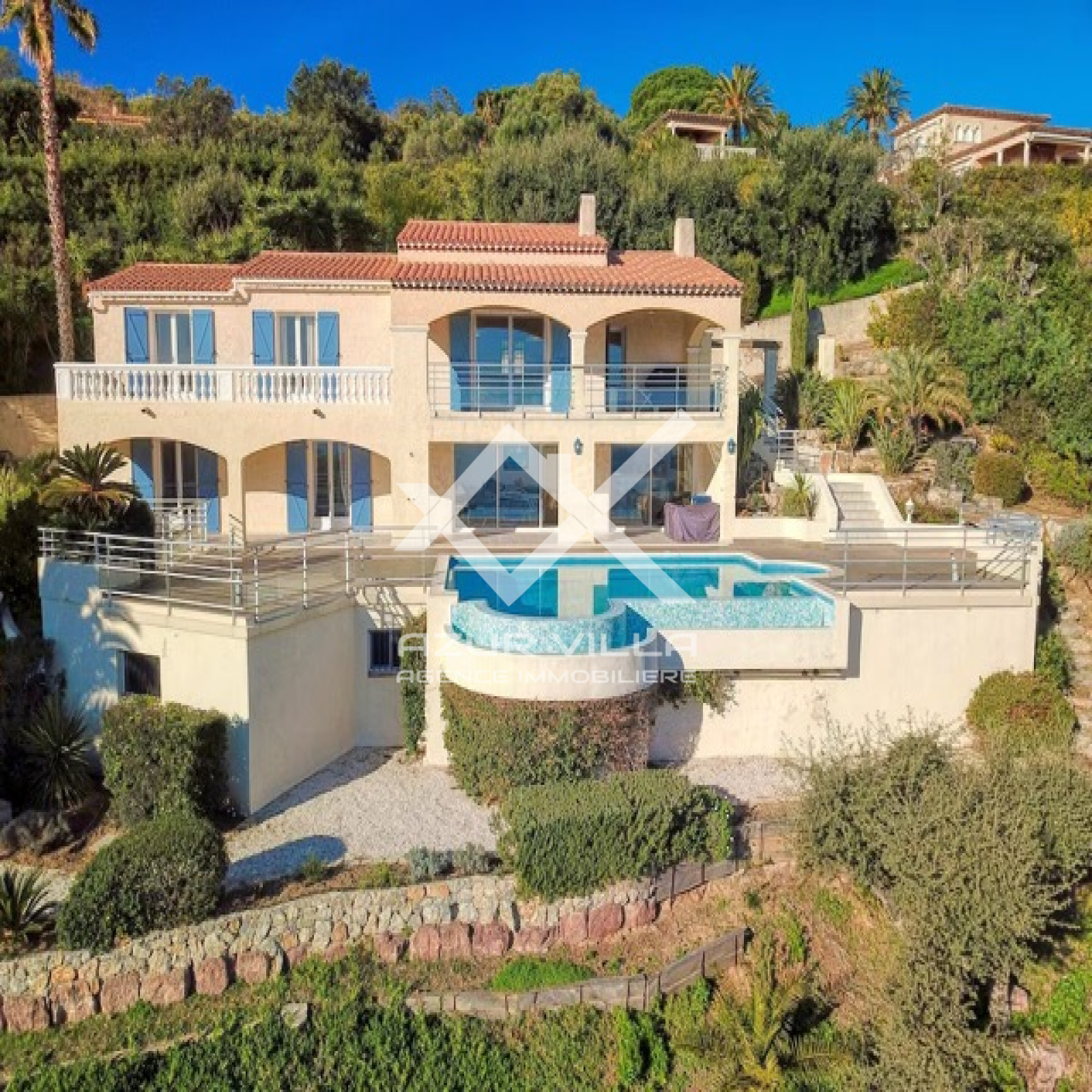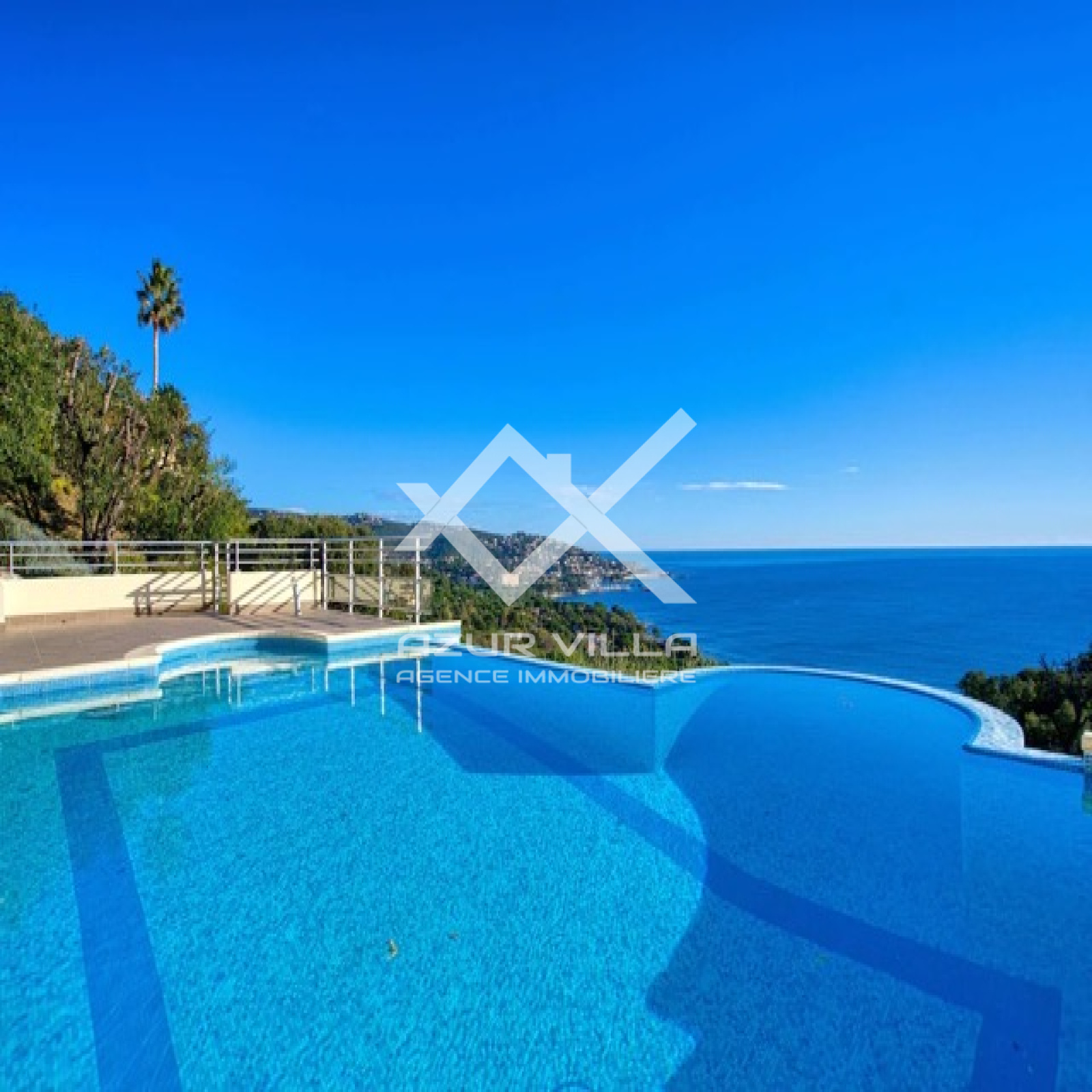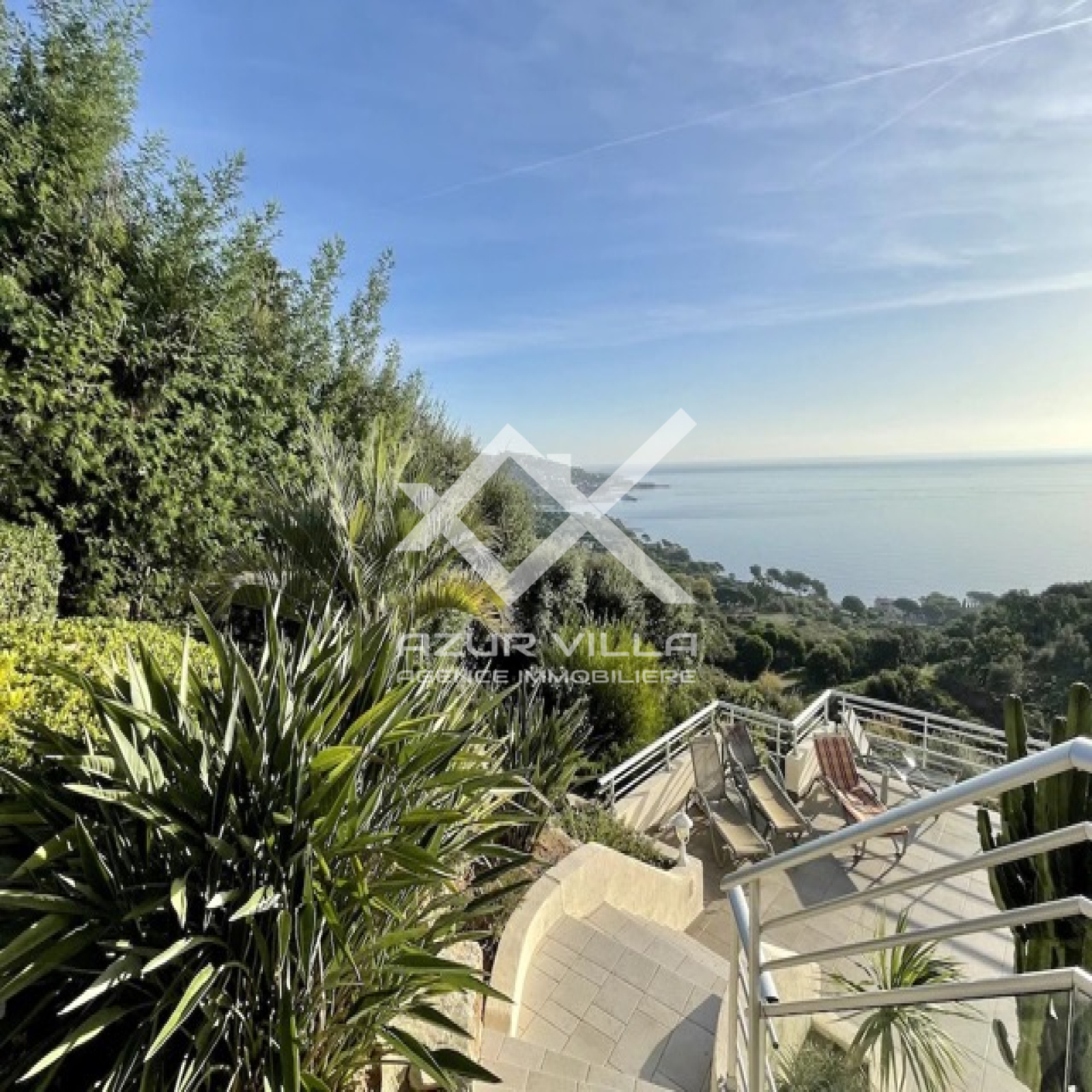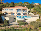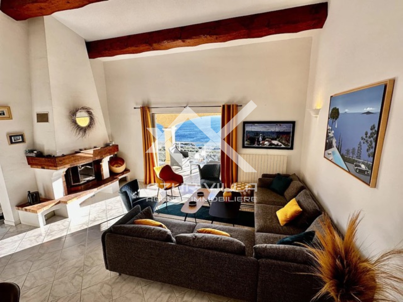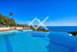 Un vaste salon avec de larges baies vitrées s'ouvrant sur des terrasses avec vue plongeante sur la mer et la piscine chauffée.