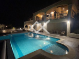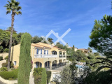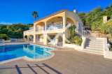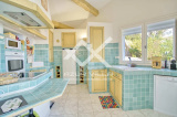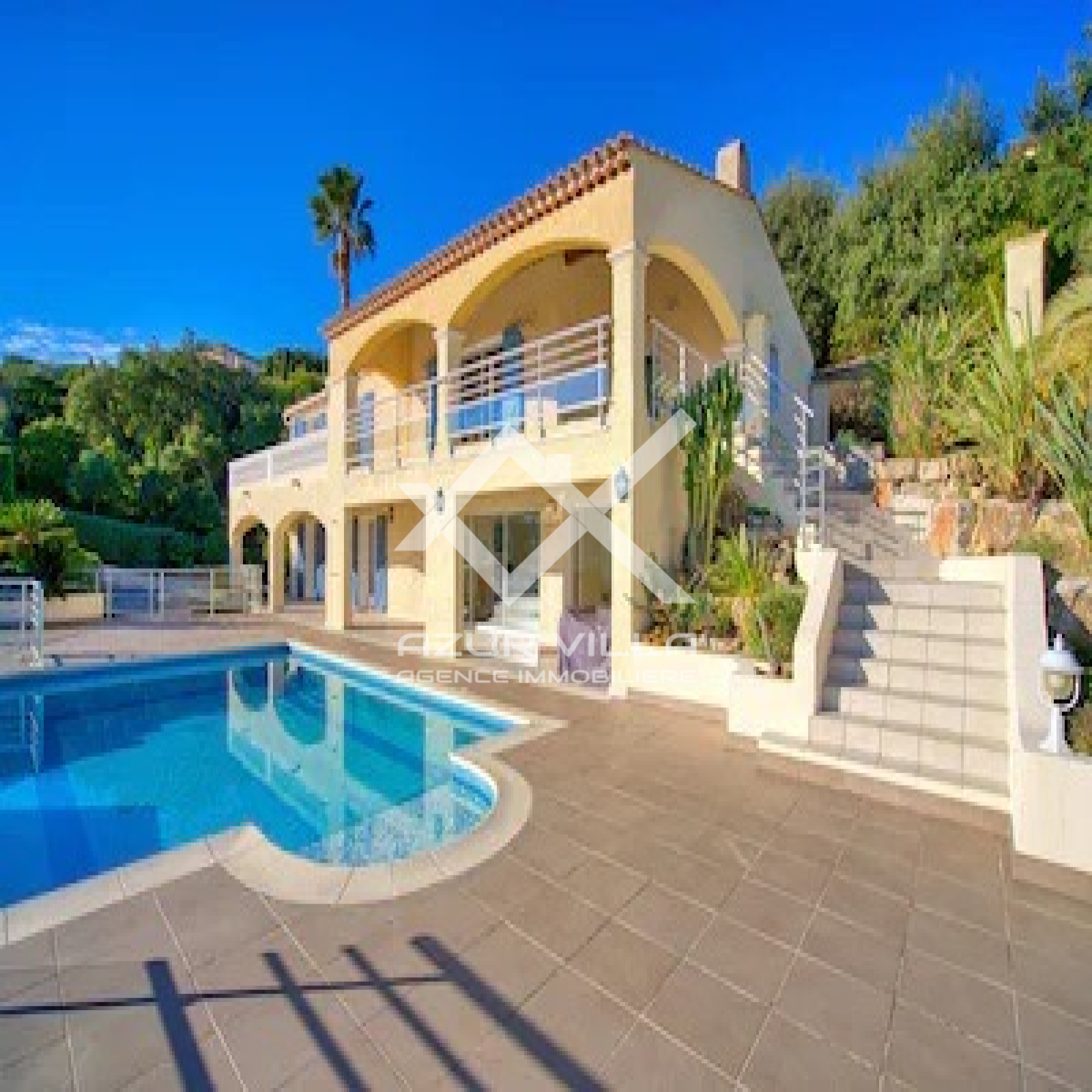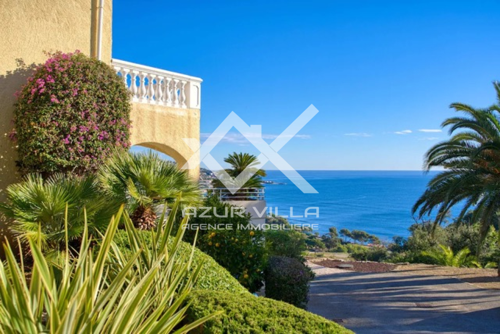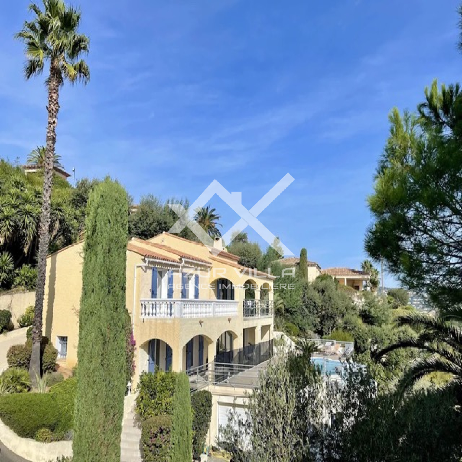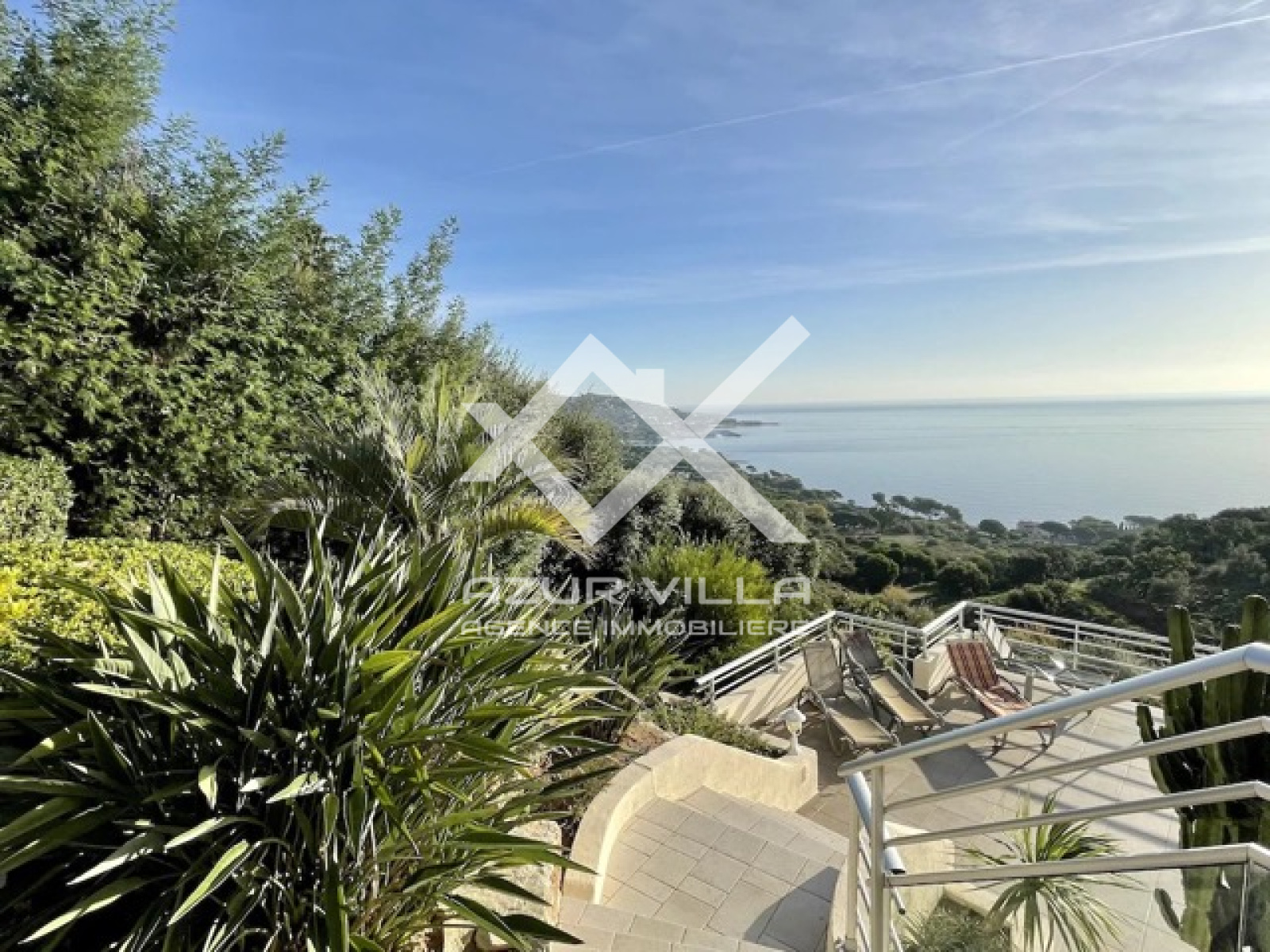 Un vaste salon avec de larges baies vitrées s'ouvrant sur des terrasses avec vue plongeante sur la mer et la piscine chauffée.