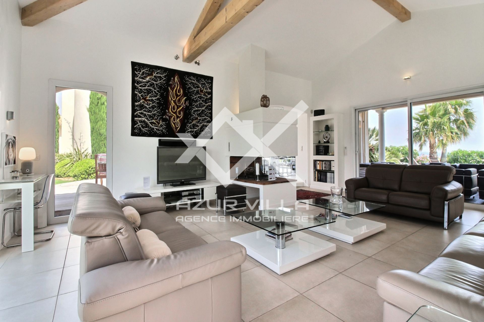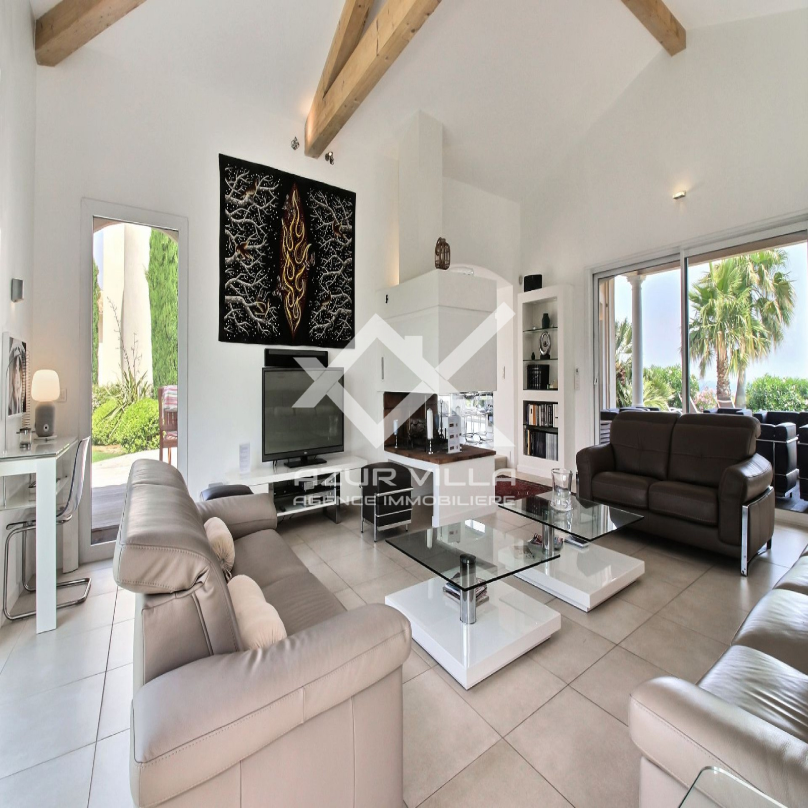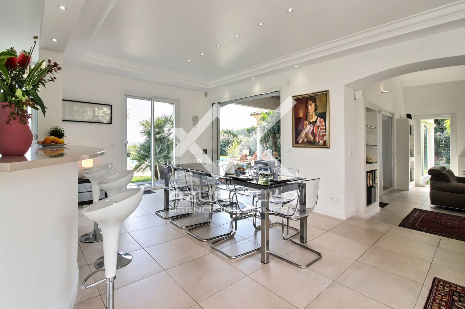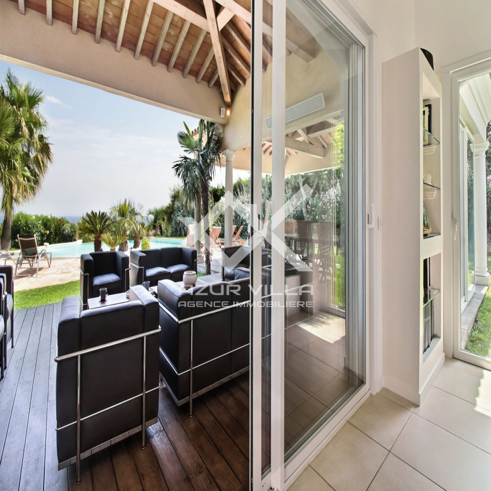 Sur le niveau zéro: un vaste séjour de 60 m² ouvrant sur une terrasse couverte de 80 m² donnant sur les plages de la piscine extérieure.
