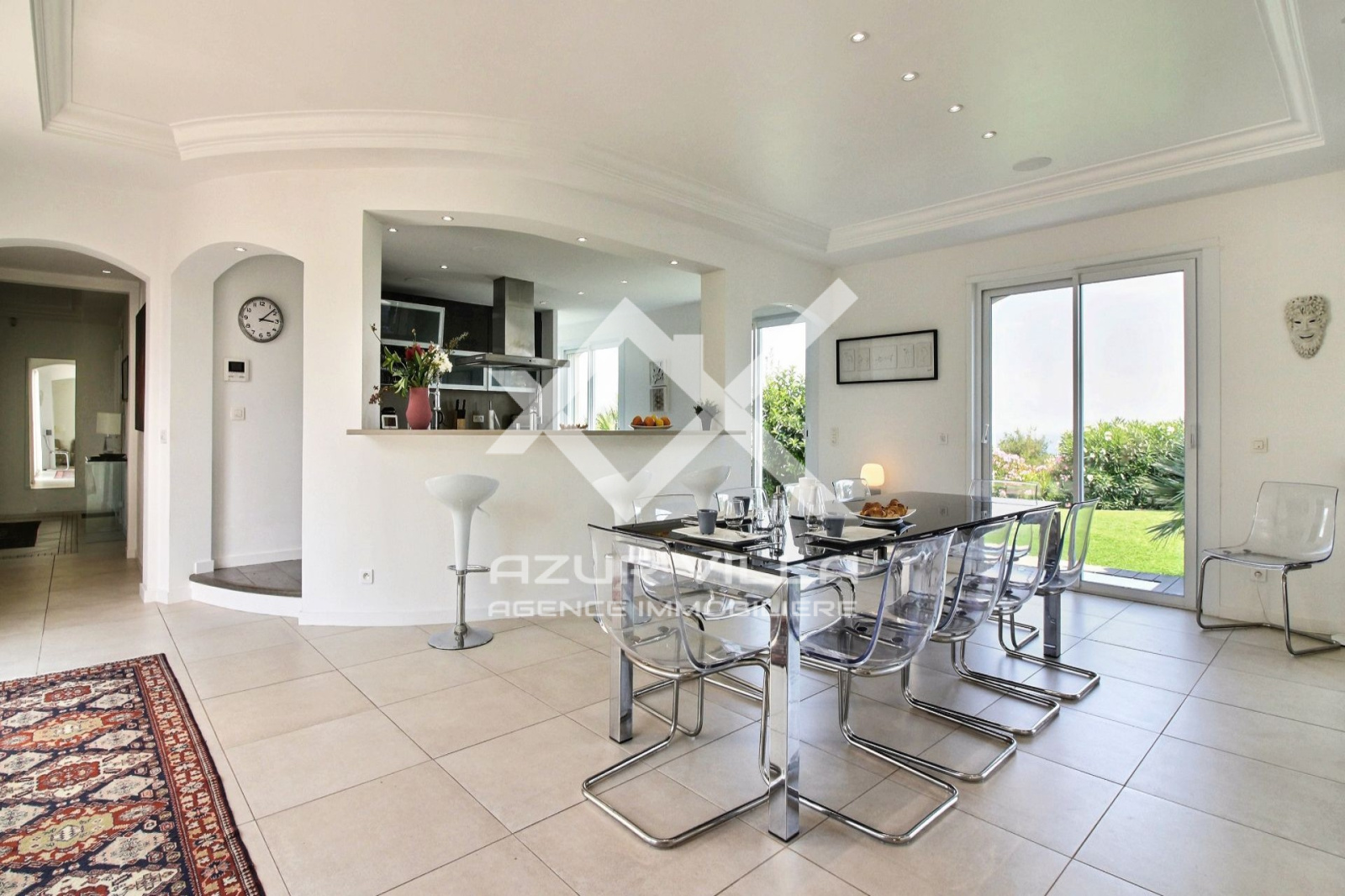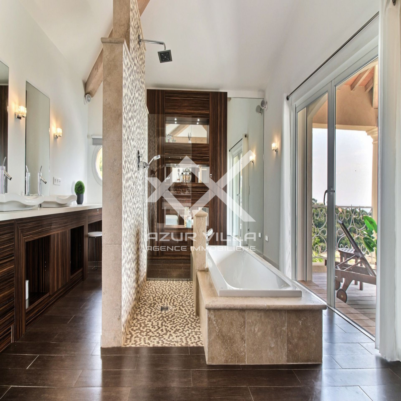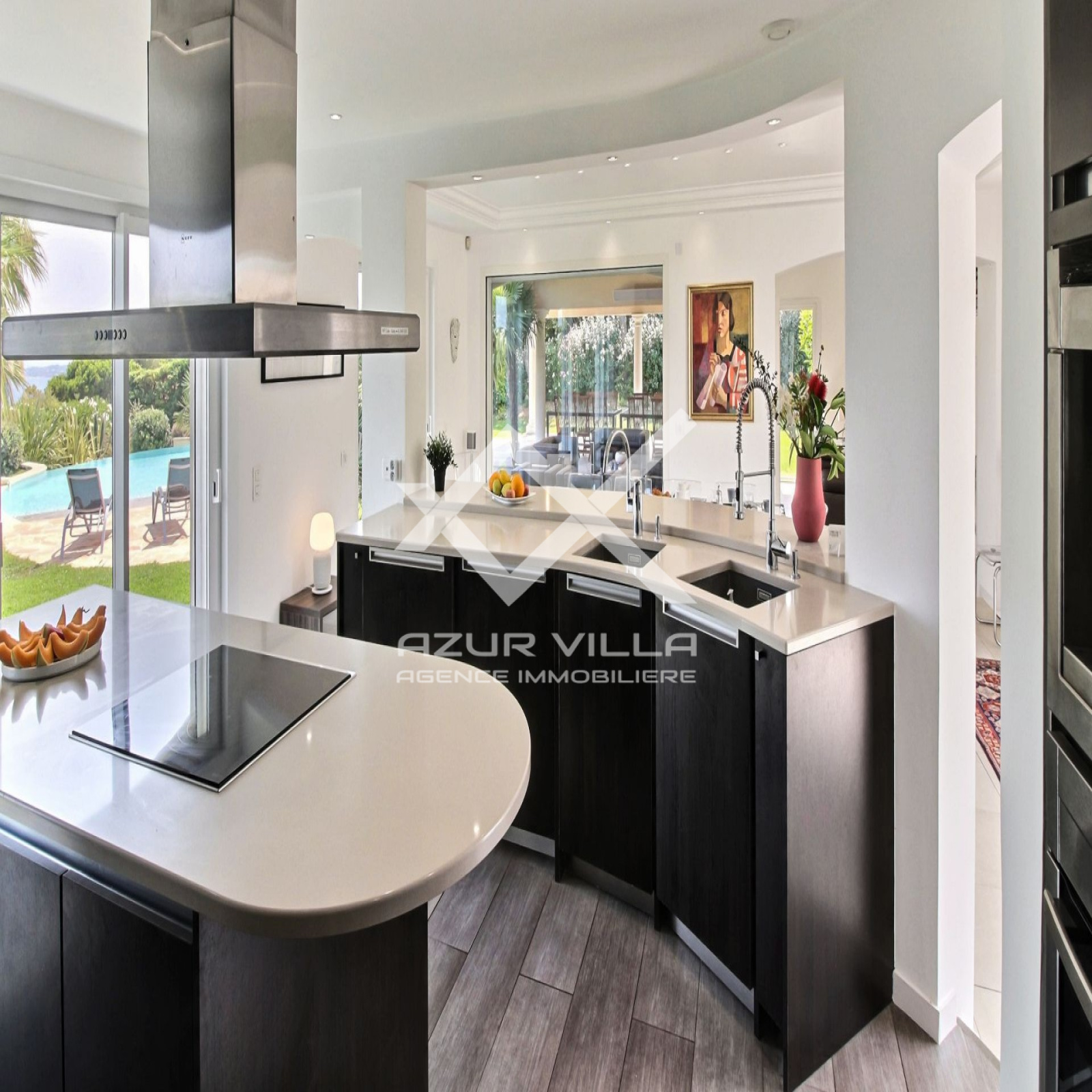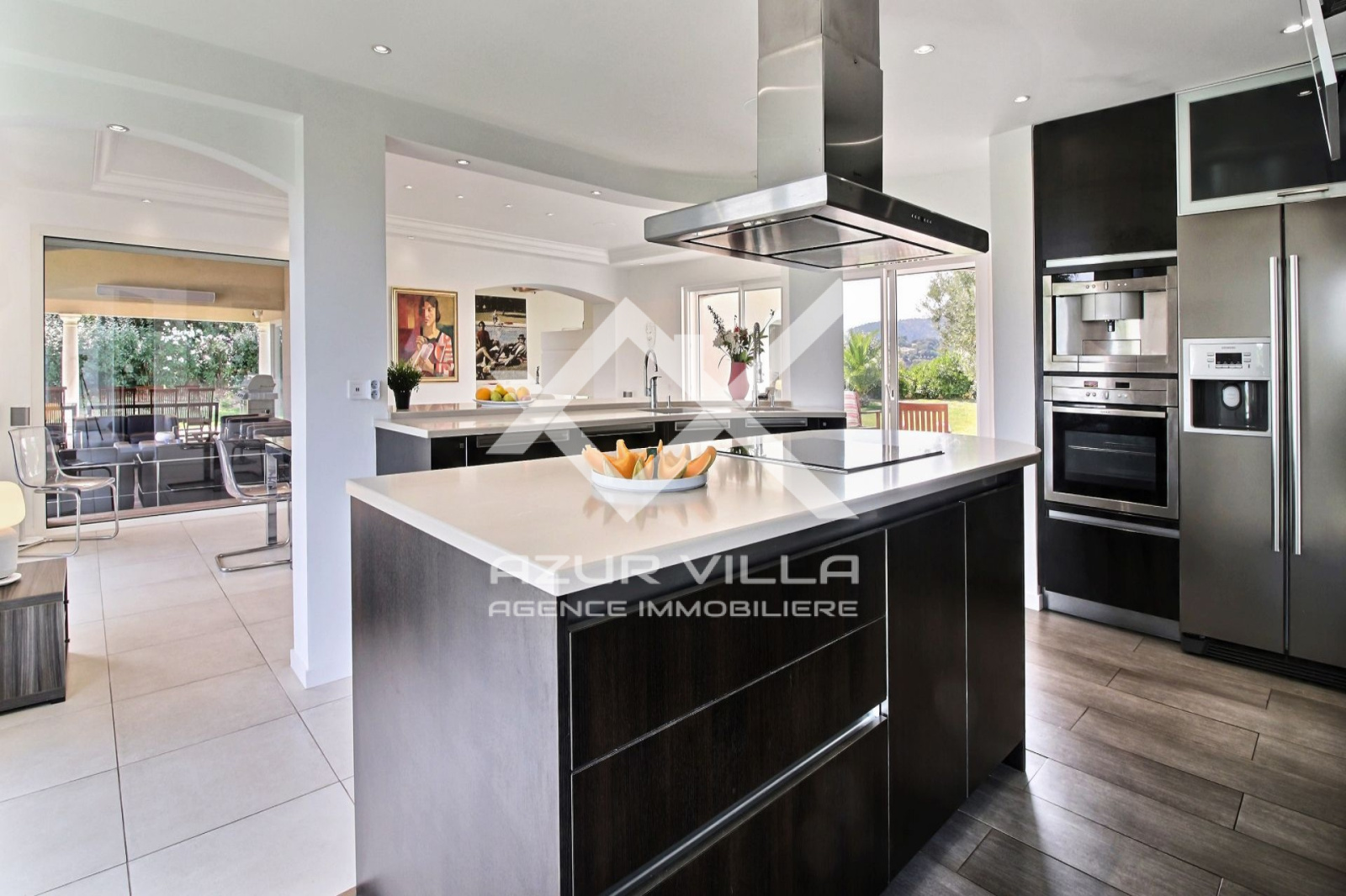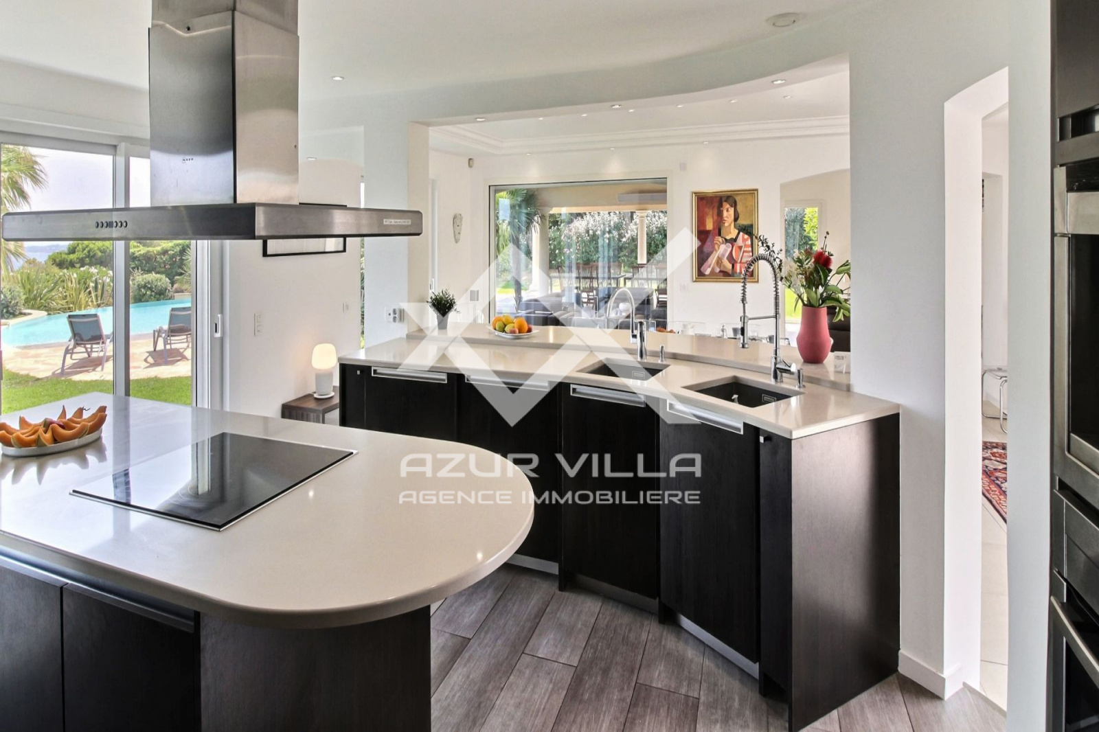 Sur le niveau zéro: un vaste séjour de 60 m² ouvrant sur une terrasse couverte de 80 m² donnant sur les plages de la piscine extérieure.