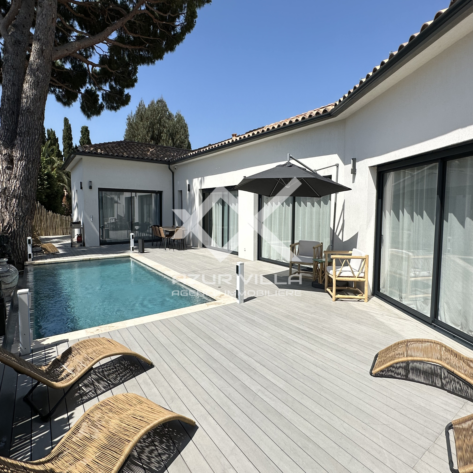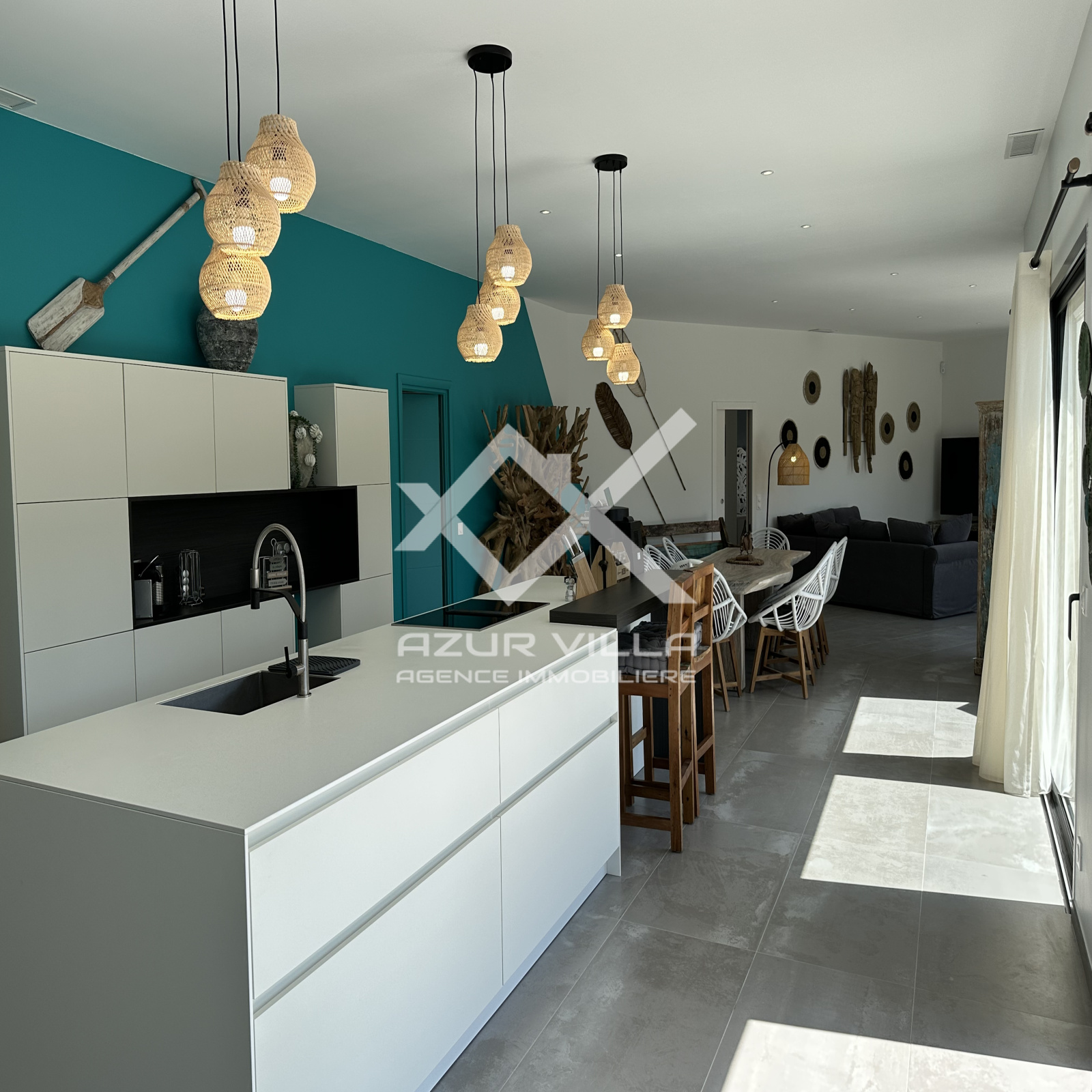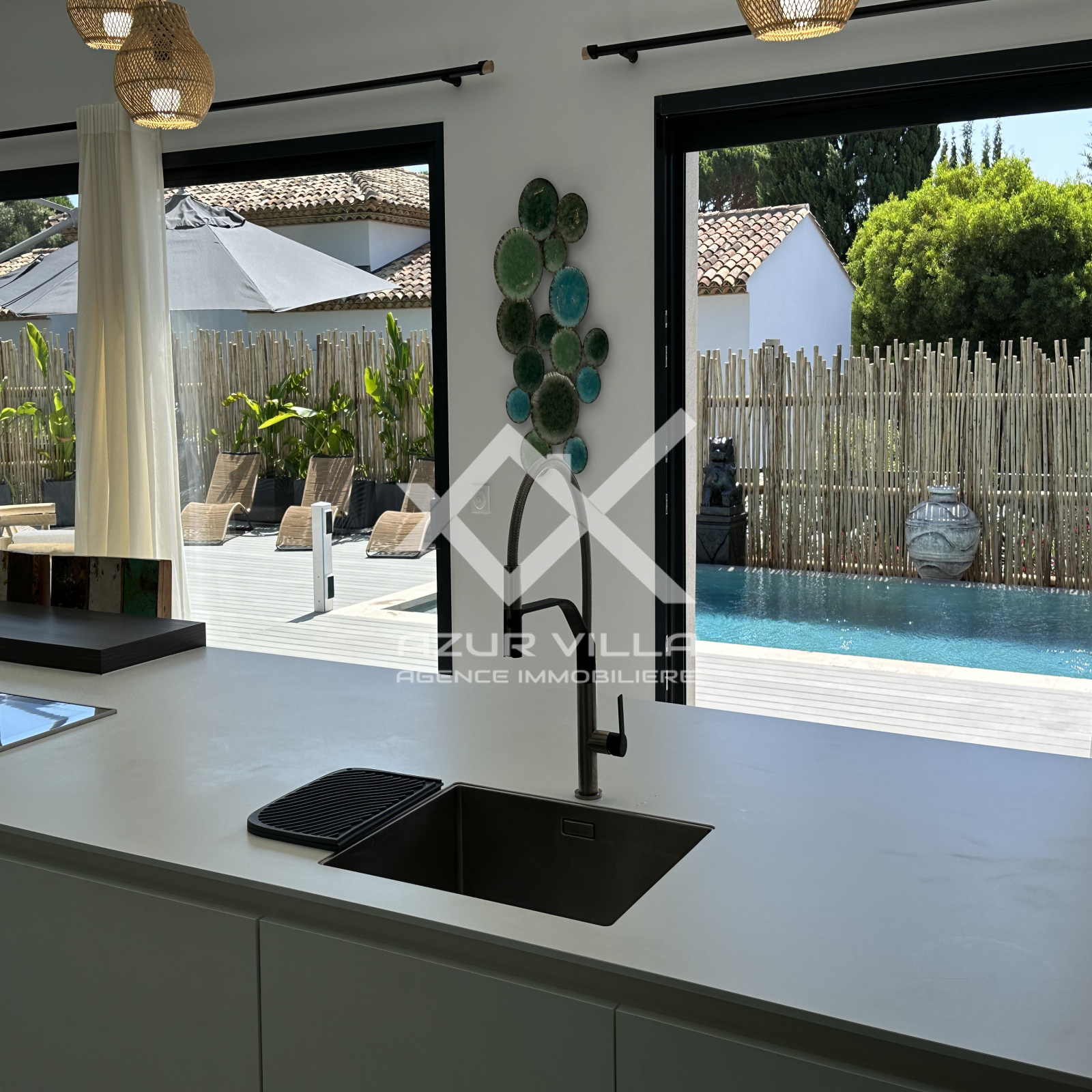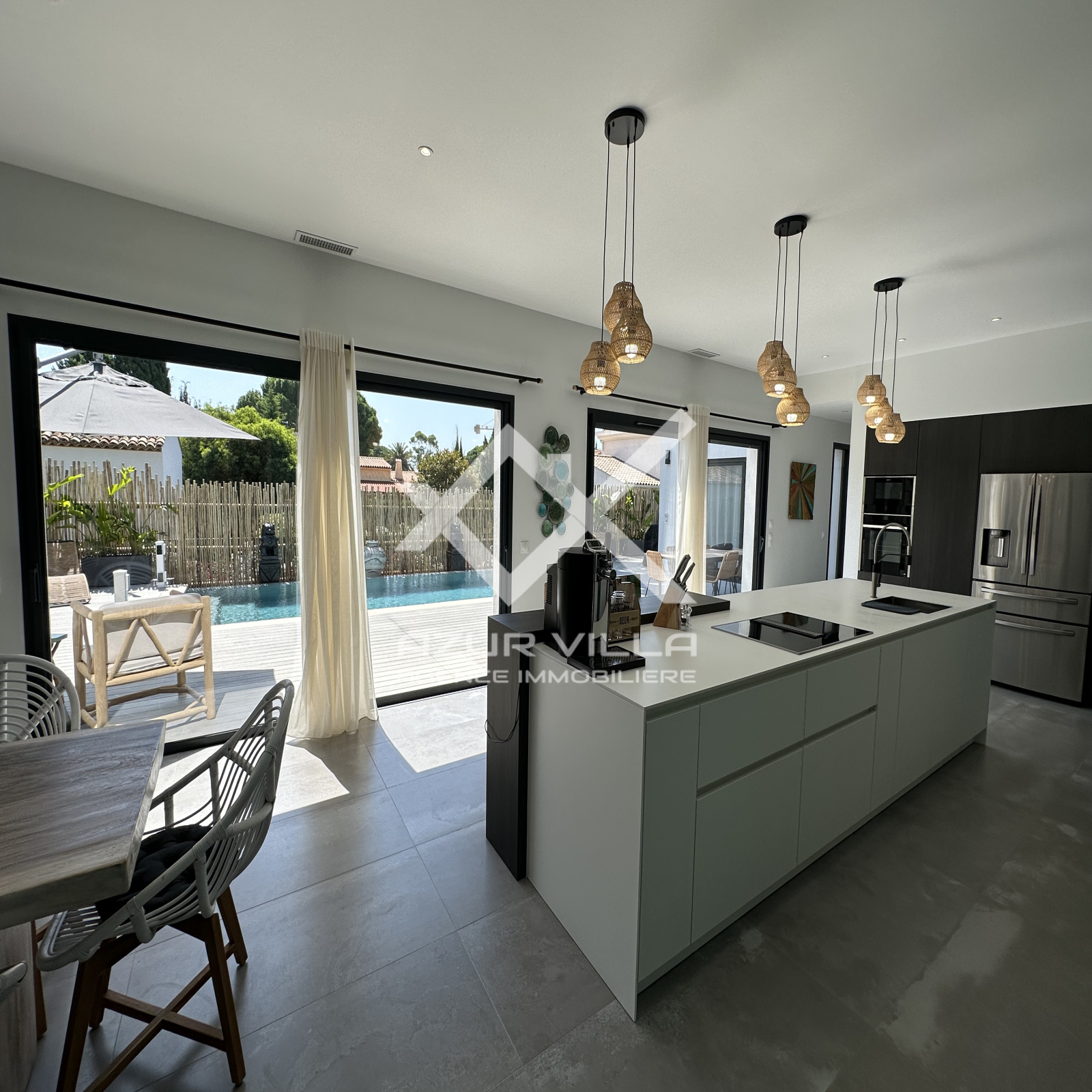 Cuisine ultra moderne entièrement équipée avec ilot central – un vaste salon et espace repas donnant sur la piscine.