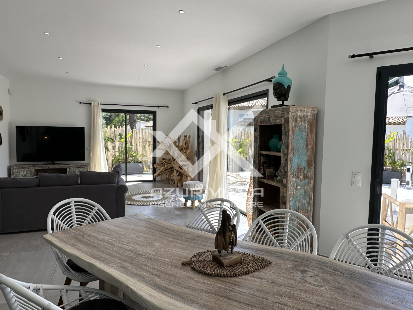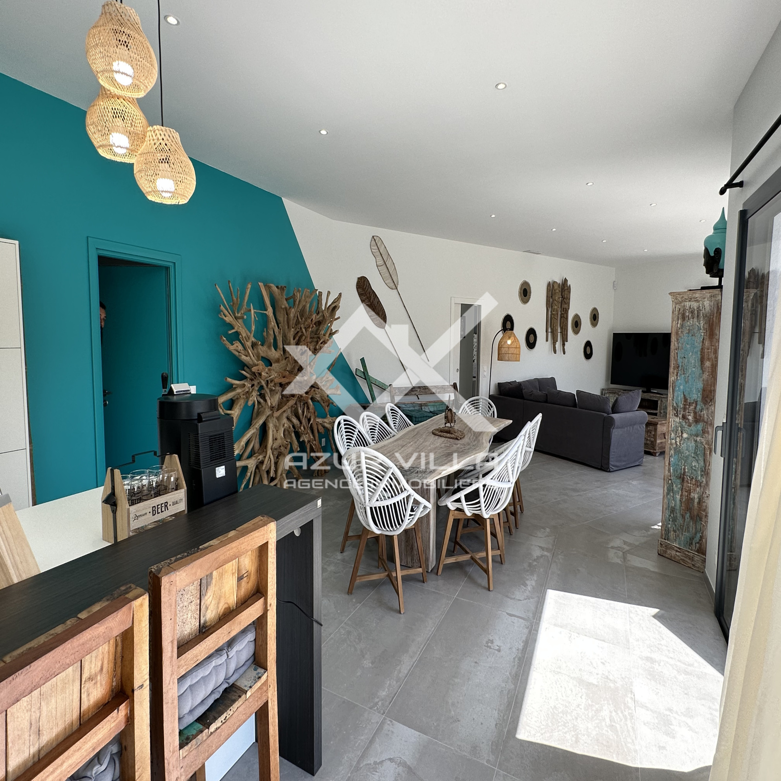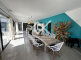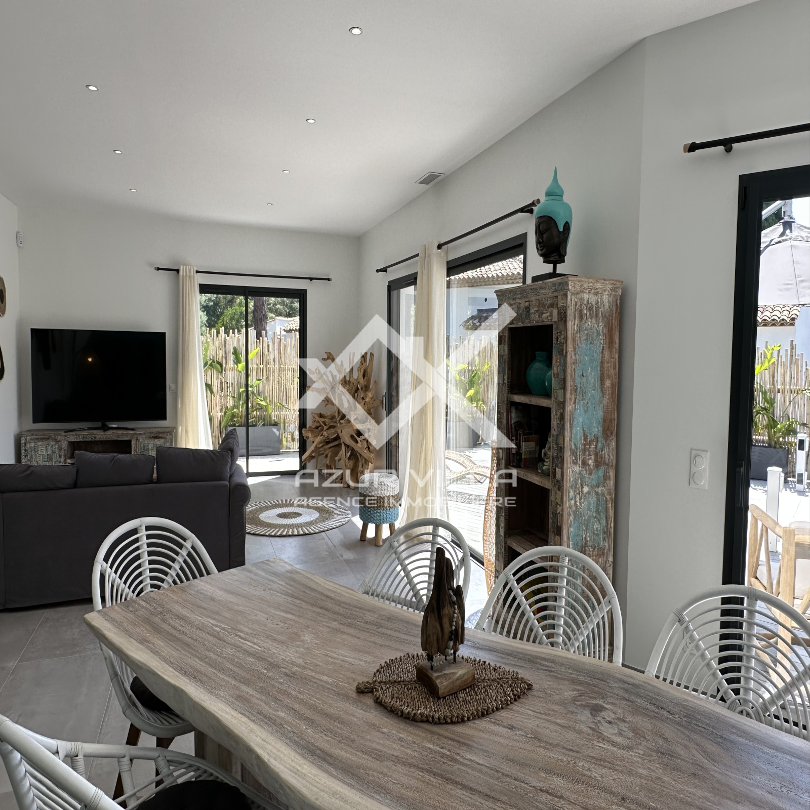 Cuisine ultra moderne entièrement équipée avec ilot central – un vaste salon et espace repas donnant sur la piscine.