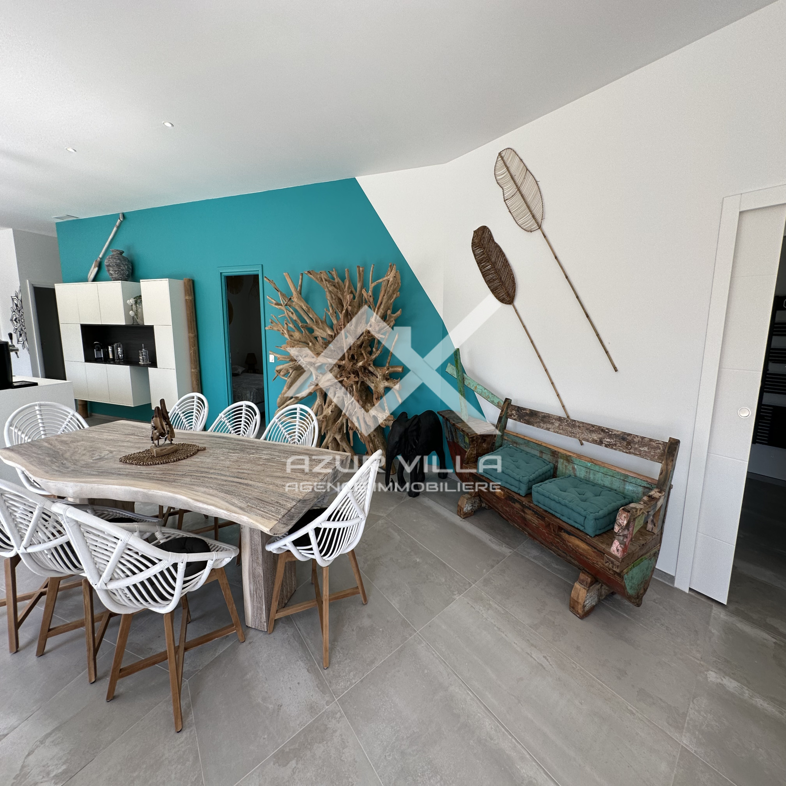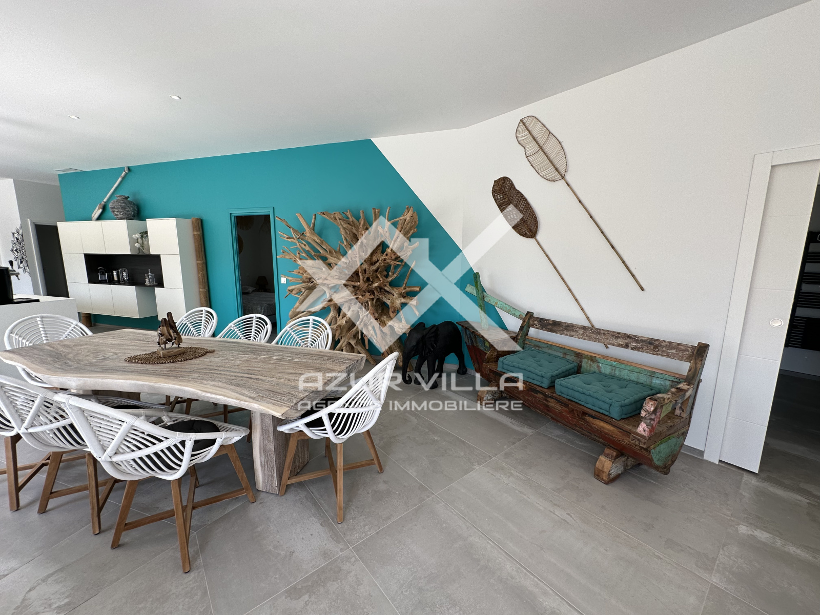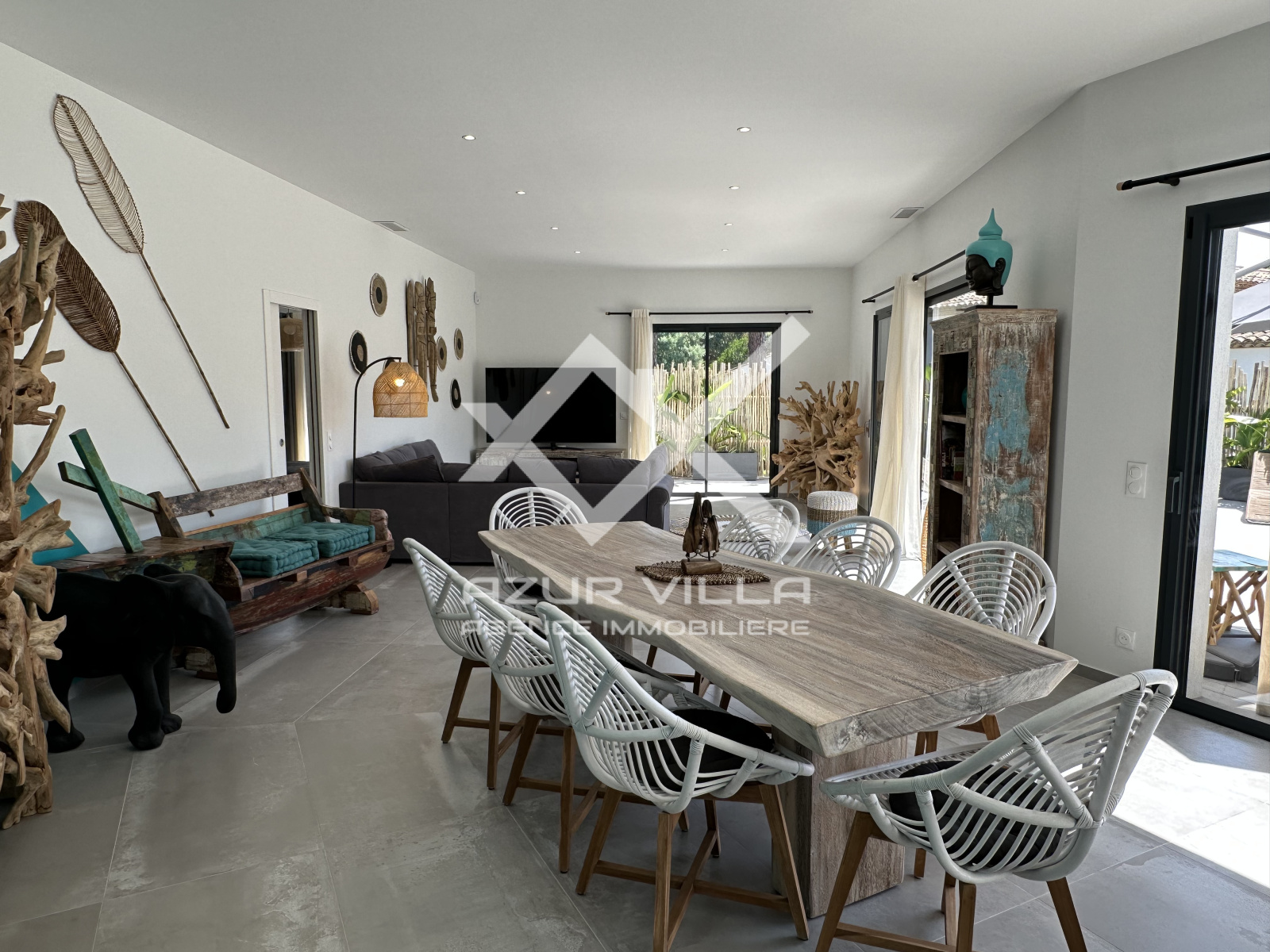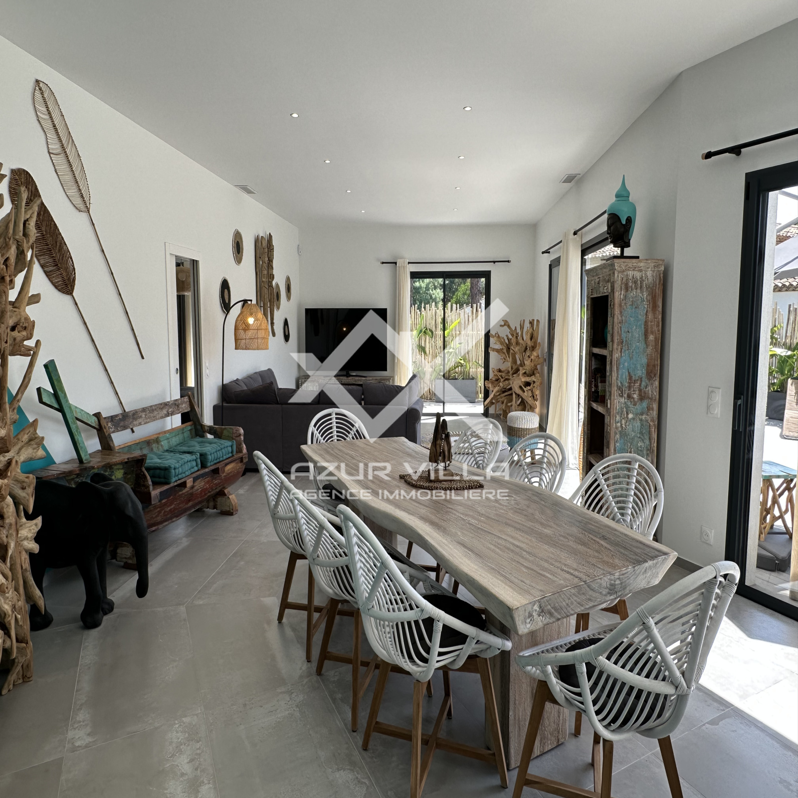 Cuisine ultra moderne entièrement équipée avec ilot central – un vaste salon et espace repas donnant sur la piscine.